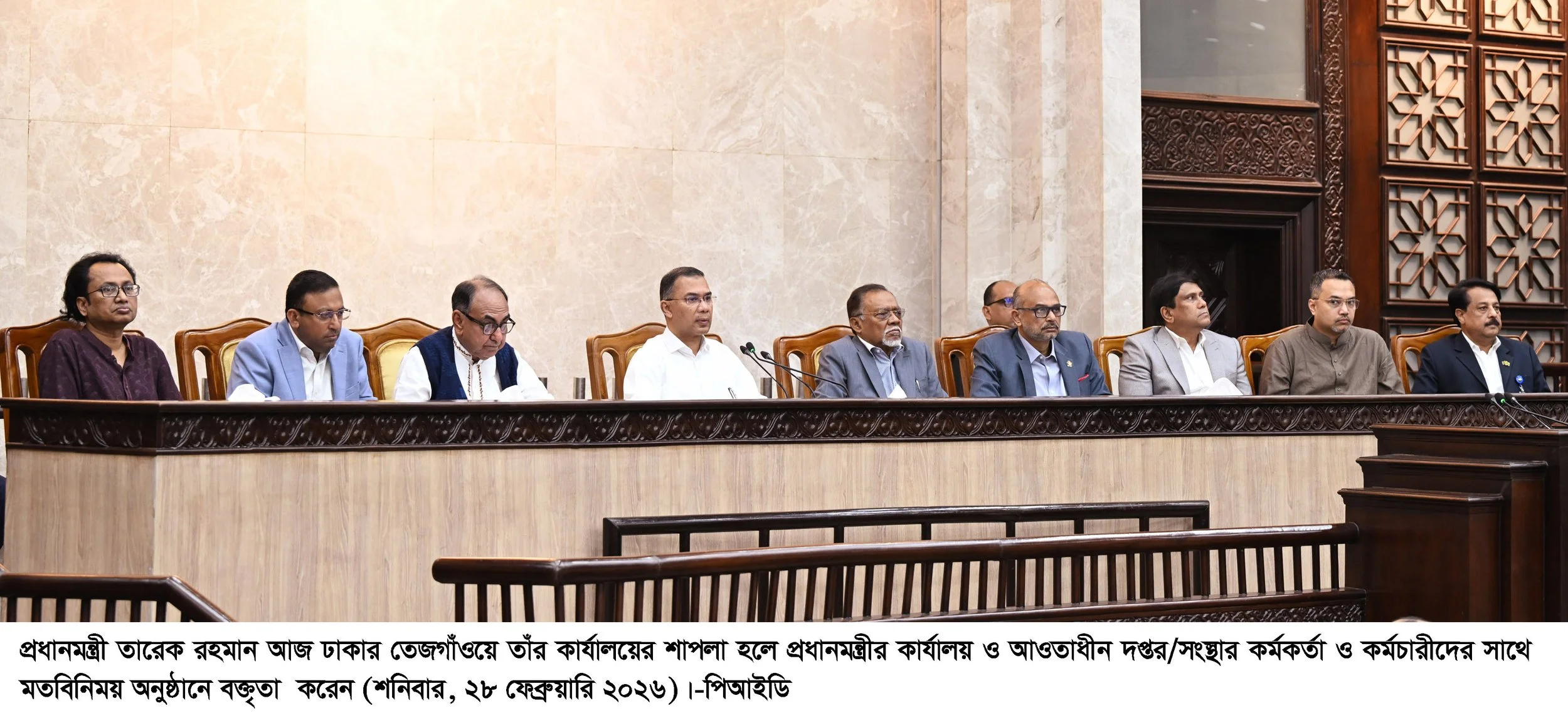 প্রধানমন্ত্রী তারেক রহমান সরকারি কর্মকর্তা ও কর্মচারীদের প্রতি দেশের মানুষের ভাগ্য পরিবর্তনে সর্বোচ্চ আন্তরিকতার সাথে কাজ করার আহ্বান জানিয়েছেন। শনিবার সকালে তেজগাঁওস্থ প্রধানমন্ত্রীর কার্যালয়ের (পিএমও) শাপলা হলে আয়োজিত এক মতবিনিময় সভায় তিনি এই নির্দেশনা দেন। দায়িত্ব গ্রহণের পর পিএমও-র কর্মকর্তা ও কর্মচারীদের সাথে এটিই ছিল তাঁর প্রথম আনুষ্ঠানিক বৈঠক।